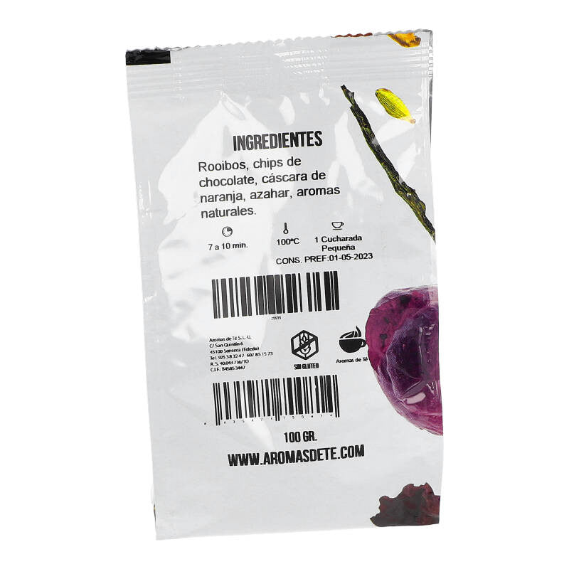 | Ingredientes | Rooibos, chocolate chips, orange peel, orange blossom, natural aromas |