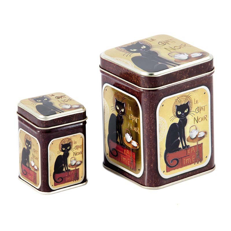 Le Chat Noir Tin Set. A 100 gram can and a 25 gram can make up the pack. Thanks to them you will be able to preserve your favorite tea or infusion in the same conditions as the day it arrived at your home, from the first gram to the last. In addition, they are a beautiful decoration motif and are very practical.