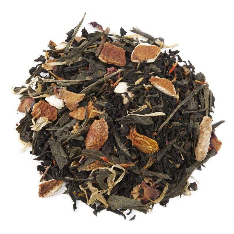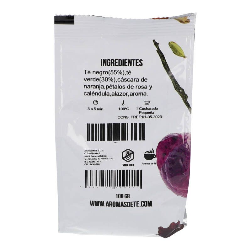 | Ingredientes | Té negro (55%), té verde (30%), cáscara de naranja, pétalos de rosa , caléndula, alazor, aromas |